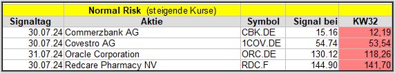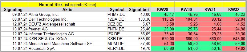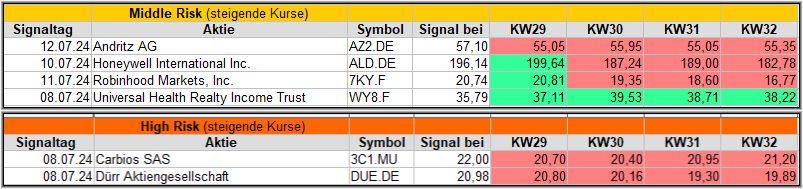 Nun kommen wir zum Update der vorigen Screener-Ergebnisse aus der KW28, KW29, KW30 und KW31, bezogen auf die Schlusskurse in KW32/24. KW27/24 fällt in dieser Woche weg.