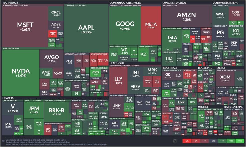 Nachfolgend die Sektorenübersicht innerhalb des S&P500, die auf den ersten Blick ein gemischtes Bild abgibt. Besonders die großen Tech-Werte (Ausnahme Microsoft / Amazon) sind grün, während der breite Markt rot tendiert.