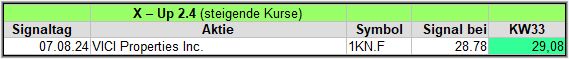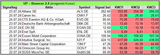 In dieser Woche gab es 11 Signale, wovon nach der 3. Woche immerhin 5 (3) der 11 Werte im Plus liegen. Die schwierigen KW31/KW32 haben hier zugeschlagen, auch wenn es etwas nach oben ging, wie wir bei der Allianz sehen, bei +12€ zur Vorwoche.