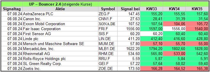 Hier veröffentliche ich die Ergebnisse meiner Bouncer-Screener, sie über 4 Wochen, ein Kursupdate erhalten, um die Wirksamkeit zu prüfen. Bitte die Hinweise am Ende beachten.