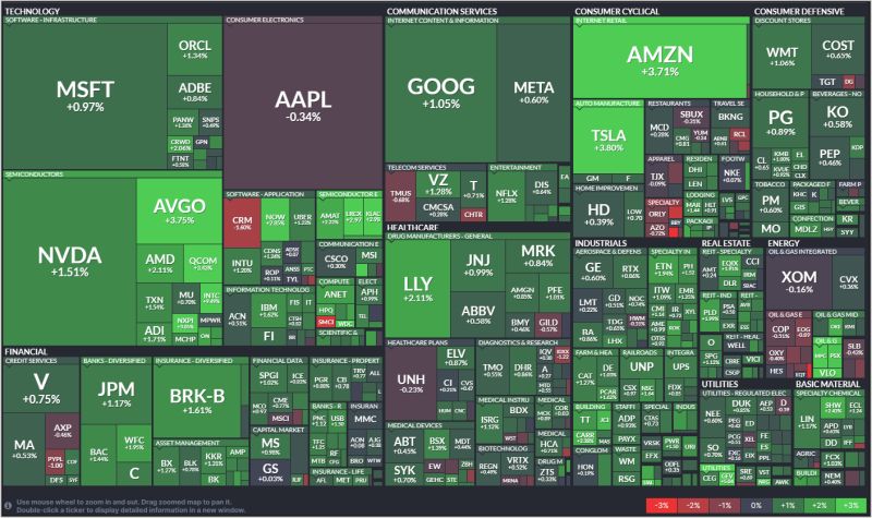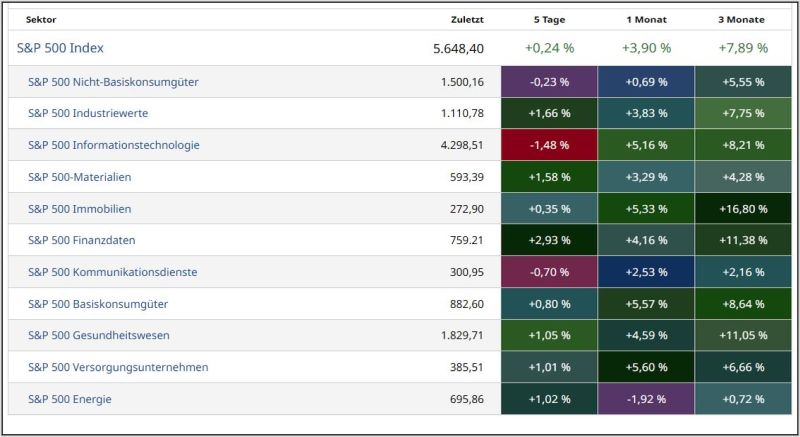 Nachfolgend die Sektorenübersicht innerhalb des S&P500. Das Bild hat sich klar in Richtung grün verschoben.