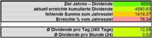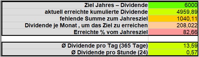 Theoretisch müsste nun jeder verbleibende Monat noch 208,02€ ( 283,87€) an Dividenden liefern, um das Jahresziel von 6.000€ zu erreichen. Das sieht weiter gut aus.