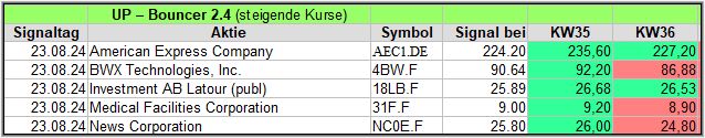 Hier veröffentliche ich die Ergebnisse meiner Bouncer-Screener, die jede Woche, um die Wirksamkeit zu prüfen, über einen Zeitraum von 4 Wochen, ein Kursupdate erhalten. Bitte die Hinweise am Ende beachten. Die aktuellen Signale veröffentliche ich täglich auf meinem Facebook Gruppe