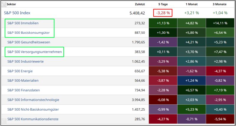 Die Top Sektoren sind an den grünen Farbtönen, die Flop Sektoren an den roten Farbtönen zu erkennen.