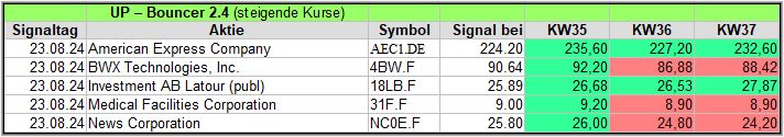 Hier veröffentliche ich die Ergebnisse meiner Bouncer-Screener, die jede Woche, um die Wirksamkeit zu prüfen, über einen Zeitraum von 4 Wochen, ein Kursupdate erhalten. Bitte die Hinweise am Ende beachten. Die aktuellen Signale veröffentliche ich täglich auf meinem Facebook Gruppe