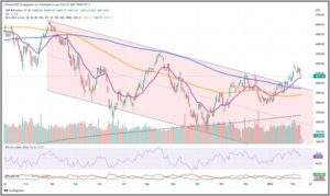 Der S&P500 hat nach seinem Ausbruch aus dem fallenden Trendkanal bei rund 4.200$ nach unten gedreht und hat am Freitag die EMA20 bei 4.056$ getestet, wobei diese bis zum Augenblick, gehalten hat.