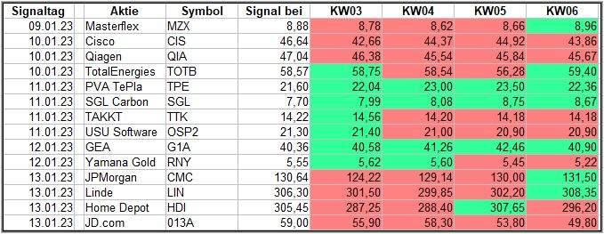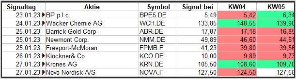 In der Woche 4 wurden 8 Signale generiert, von denen allerdings mit BP, Wacker Chemie und Krones, nur 3 (2) Werte im grünen Bereich lagen. Novo Nordisk schloss genau auf dem Kurs des Signals.