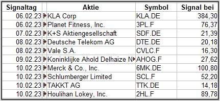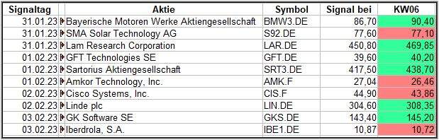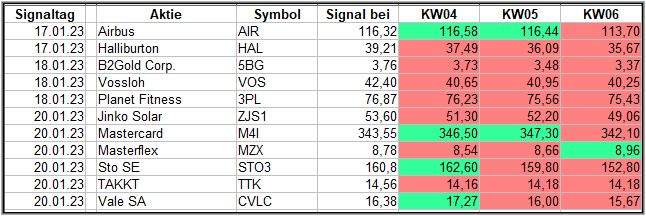 Nun kommen wir zum Update der vorigen Screener-Ergebnisse aus der KW02, KW03, KW04 und KW05, bezogen auf die Schlusskurse in KW06/23. KW01/23 fällt in dieser Woche weg.