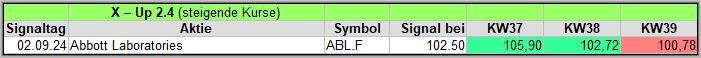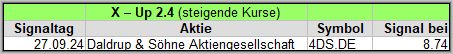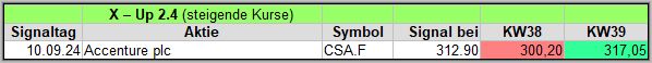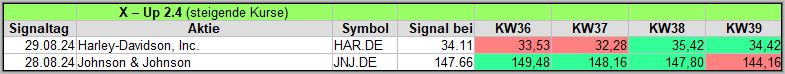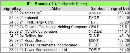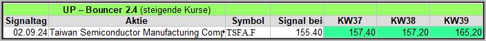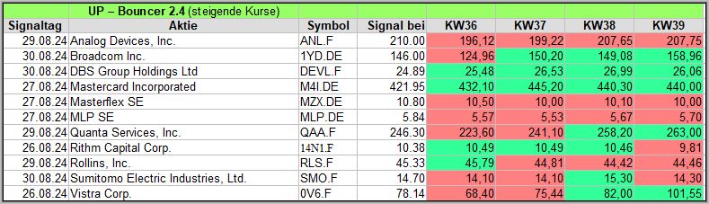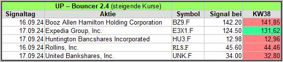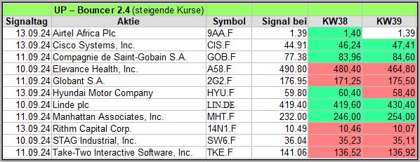 Die meisten Signale in dieser Woche, gab es im UP-Bouncer, nämlich 11 Signale. Nach der 2. Woche liegen 4 (6) der 11 Signale im Plus, teilweise über 20€/Aktie. ![]()