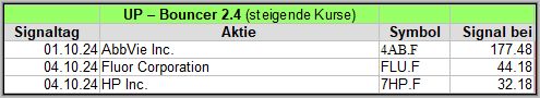 Hier veröffentliche ich die Ergebnisse meiner Bouncer-Screener, die jede Woche, um die Wirksamkeit zu prüfen, über einen Zeitraum von 4 Wochen, ein Kursupdate erhalten. Bitte die Hinweise am Ende beachten. Die aktuellen Signale veröffentliche ich täglich auf meinem Facebook Gruppe .