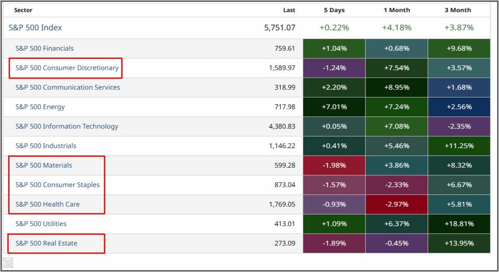 Nach wie vor sind die Werte, die im Minus abschlossen (rot markiert) merkwürdig. Bei fast allen handelt es sich nämlich um Zins abhängige Sektoren, die eigentlich von einer Zinssenkung profitieren müssten.