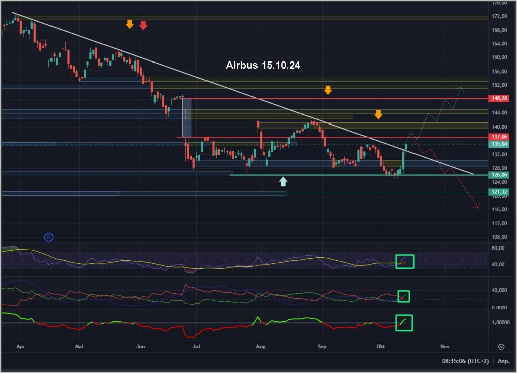 Das mögliche Szenario aufwärts habe ich skizziert, wobei es zwei massive Widerstände gibt, die bei 138€ und bei 148,30€ liegen.