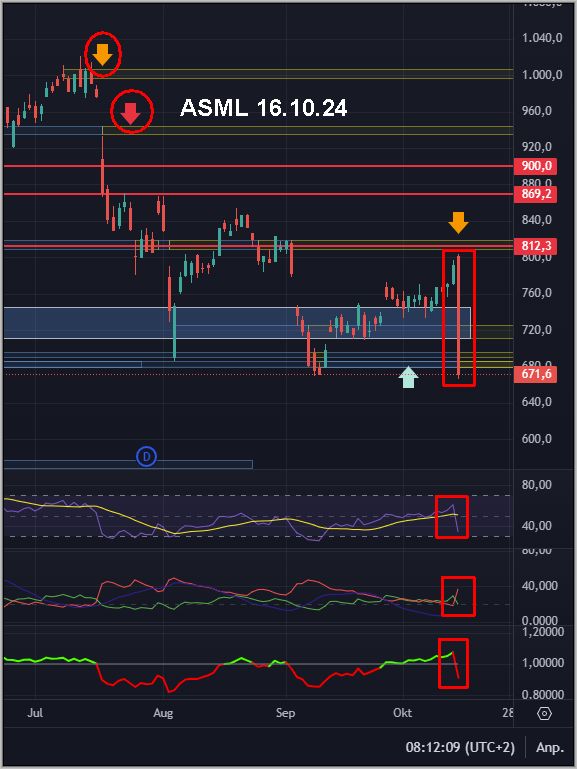 Da könnte also noch etwas nachkommen. Der Kurs von ASML ist übrigens noch nicht überverkauft und könnte weiter nachgeben, wobei mein nächstes Ziel bei 642€ und das Worst Case bei 560€ liegen könnte.