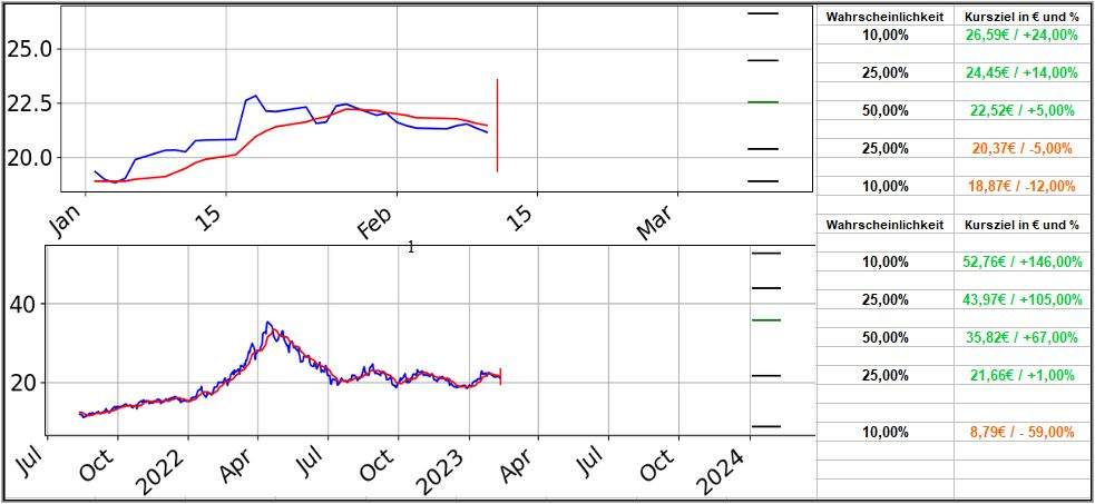 Der durchschnittlich zu erwartende Mittelkurs (Wahrscheinlichkeit 50%) auf Sicht von 1 Jahr, liegt im Plus und das mit satten +67%, bei 35,82€.