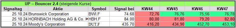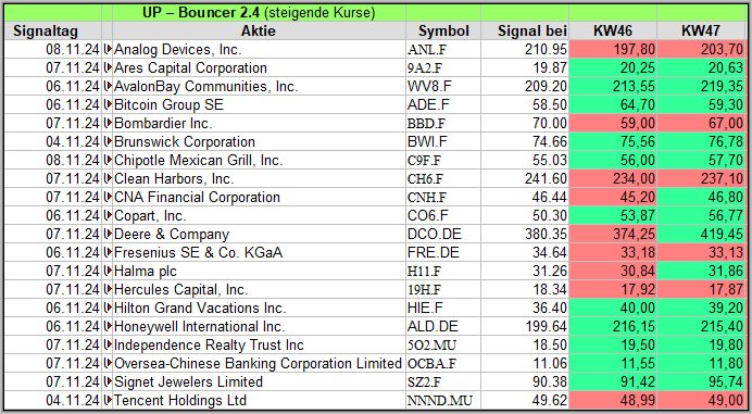 US-Wahl (Dienstag), Bruch der Ampel Koalition in Deutschland (Mittwoch) und FED Zinssenkung (Donnerstag) bewegten die Kurse. Besonders die Wahl Trumps stimulierte die Märkte, was sich in 20 UP-Bouncer Signalen niederschlug.