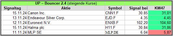 Hier veröffentliche ich über einen Zeitraum von 4 Wochen die Ergebnisse meiner Bouncer Signale, die ein wöchentliches Update erhalten, um die Wirksamkeit zu prüfen. Bitte die Hinweise am Ende beachten. Die aktuellen Signale veröffentliche ich täglich auf meinem Facebook Gruppe .