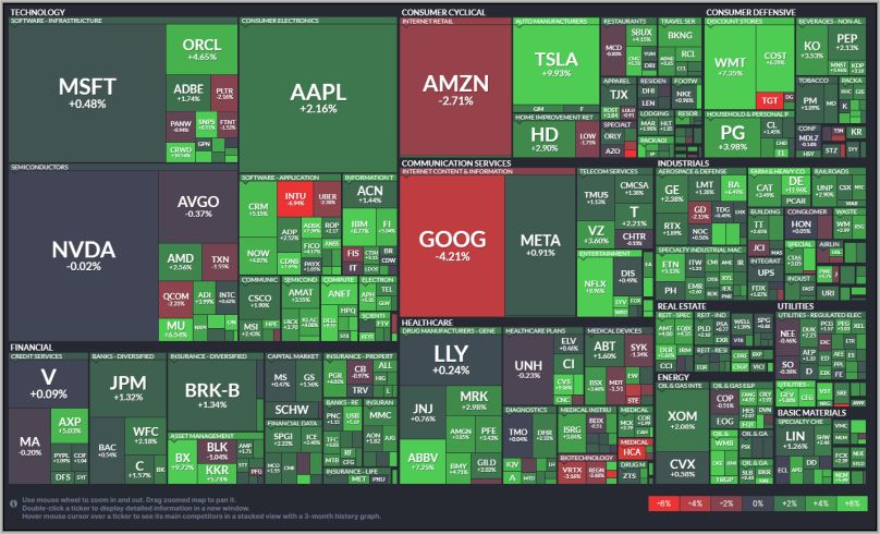 Der Unterschied zur Vorwoche ist erneut unschwer zu erkennen. Die Farbe ist deutlich von Rot in Richtung Grün verändert und während in der Vorwoche die großen Tech-Werte verloren haben , waren diese nun wieder unter den Gewinnern.