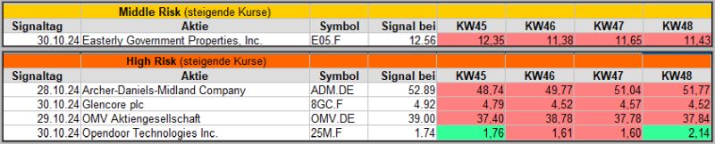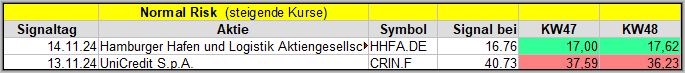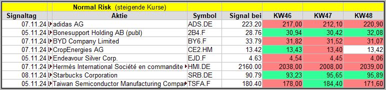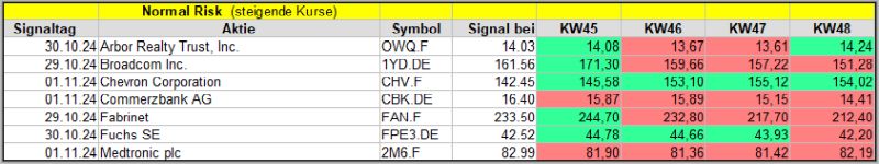 Den Kursverlauf der einzelnen Werte verfolge ich ab einem generierten Signal, über einen Zeitraum von 4 Wochen und mit einem wöchentlichen Update. (Kursiv geschriebene Texte sind in der Regel Texte aus der Vergangenheit bzw. sind Hinweise.)