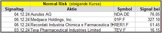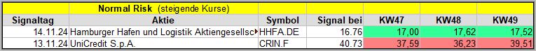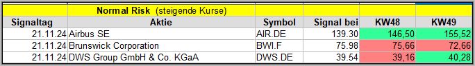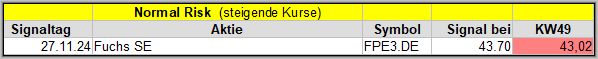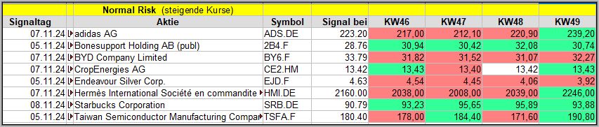 Den Kursverlauf der einzelnen Werte verfolge ich ab einem generierten Signal, über einen Zeitraum von 4 Wochen und mit einem wöchentlichen Update. (Kursiv geschriebene Texte sind in der Regel Texte aus der Vergangenheit bzw. sind Hinweise.)
