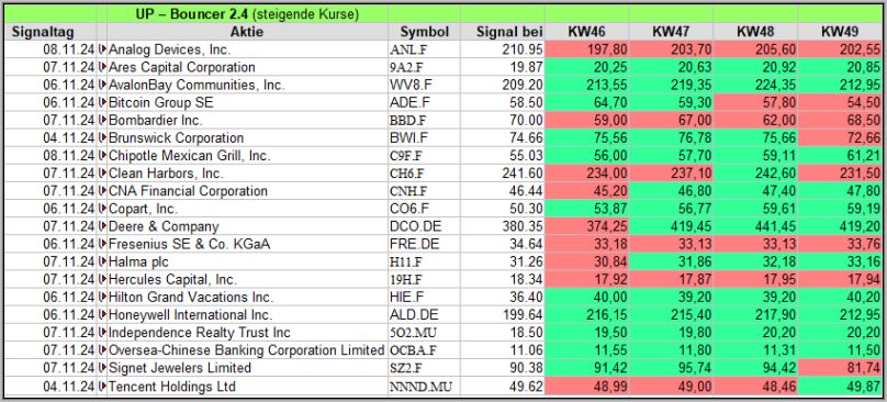 US-Wahl (Dienstag), Bruch der Ampel Koalition in Deutschland (Mittwoch) und FED Zinssenkung (Donnerstag) bewegten die Kurse. Besonders die Wahl Trumps stimulierte die Märkte, was sich in 20 UP-Bouncer Signalen niederschlug.