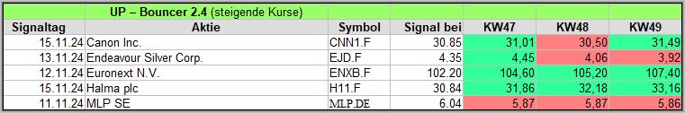 Hier veröffentliche ich über einen Zeitraum von 4 Wochen die Ergebnisse meiner Bouncer Signale, die ein wöchentliches Update erhalten, um die Wirksamkeit zu prüfen. Bitte die Hinweise am Ende beachten. Die aktuellen Signale veröffentliche ich täglich auf meinem Facebook Gruppe .