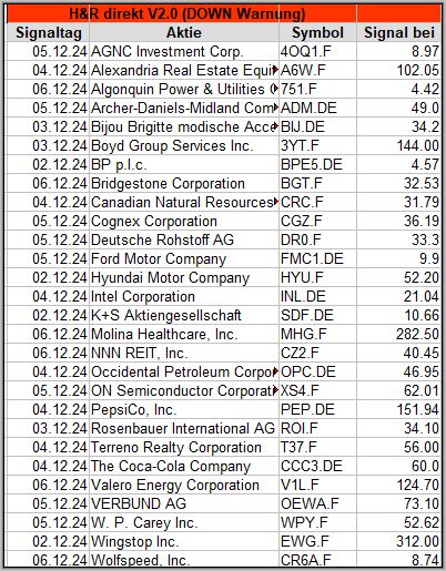 In dieser Woche gab es 28 (6) bestätigte Warnsignale, also 22 Signale mehr als in der Vorwoche. Das ist kein besonders gutes Zeichen, wobei viele Reits enthalten sind, die möglicherweise auch aufgrund einer Dividendenausschüttung, ein Down-Signal generiert haben könnten. Ich habe das aber nicht nachgeprüft.