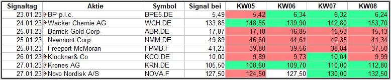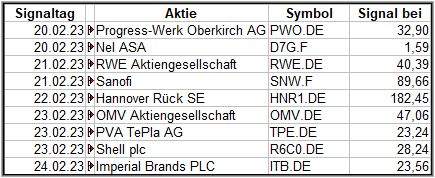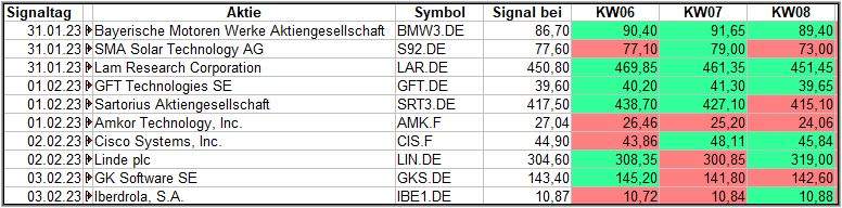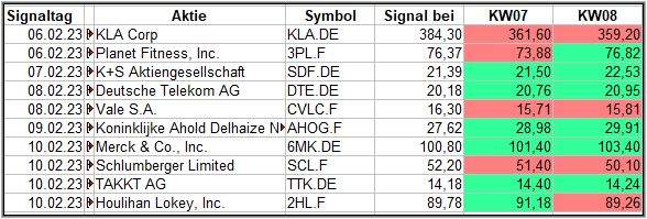 Nun kommen wir zum Update der vorigen Screener-Ergebnisse aus der KW04, KW05, KW06 und KW07, bezogen auf die Schlusskurse in KW08/23. KW03/23 fällt in dieser Woche weg.