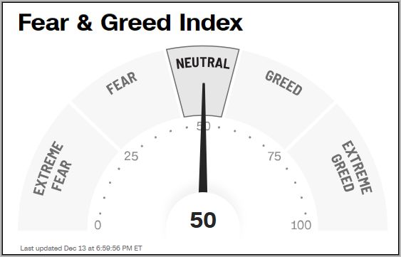 Der Fear & Greed Index hat sich in dieser Woche wenig verändert und hat Vergleich zur Vorwoche von 53 Punkten auf 50 Punkte nachgegeben. Damit liegt er exakt in der Mitte der Bereich und ist neutral, neutraler geht nicht.