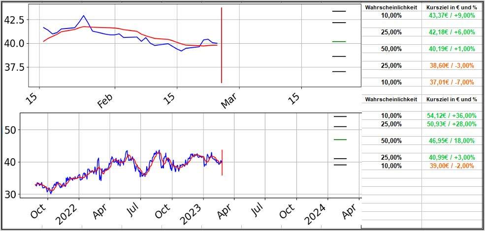 - Wahrscheinlickkeit 50%: Der durchschnittlich zu erwartende Mittelkurs ausgehend vom aktuellen Kurs, liegt mit 1% im Plus, bei 40,19€.