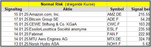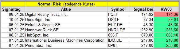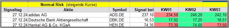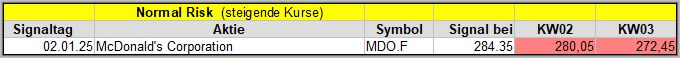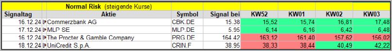 Den Kursverlauf der einzelnen Werte verfolge ich ab einem generierten Signal, über einen Zeitraum von 4 Wochen und mit einem wöchentlichen Update. (Kursiv geschriebene Texte sind in der Regel Texte aus der Vergangenheit bzw. sind Hinweise.)