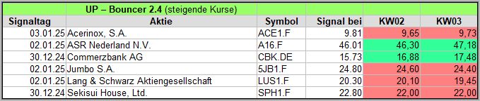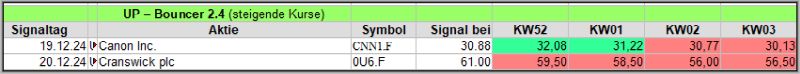 Nachfolgend die Bouncer-Ergebnisse der vergangenen 4 Wochen anhand denen jeder selbst prüfen kann, wie erfolgreich die eigene Auswahl aus den angebotenen Signal-Werten gewesen wäre. Bei den Signalen handelt es sich nur um eine Vorauswahl, die man selbst prüfen und entsprechend nutzen könnte. Die Signale werden börsentäglich in der FB Gruppe AktienChartCheck kostenfrei veröffentlicht.