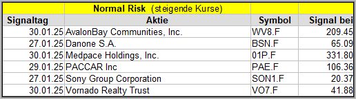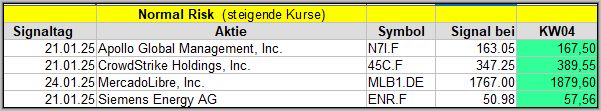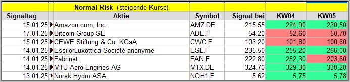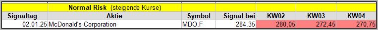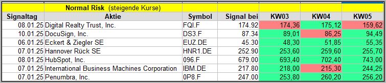 Den Kursverlauf der einzelnen Werte verfolge ich ab einem generierten Signal, über einen Zeitraum von 4 Wochen und mit einem wöchentlichen Update. (Kursiv geschriebene Texte sind in der Regel Texte aus der Vergangenheit bzw. sind Hinweise.)