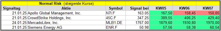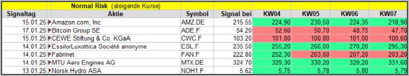 Den Kursverlauf der einzelnen Werte verfolge ich ab einem generierten Signal, über einen Zeitraum von 4 Wochen und mit einem wöchentlichen Update. (Kursiv geschriebene Texte sind in der Regel Texte aus der Vergangenheit bzw. sind Hinweise.)
