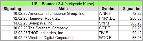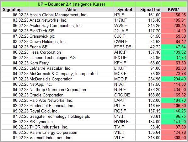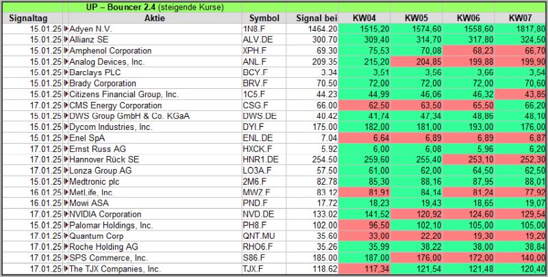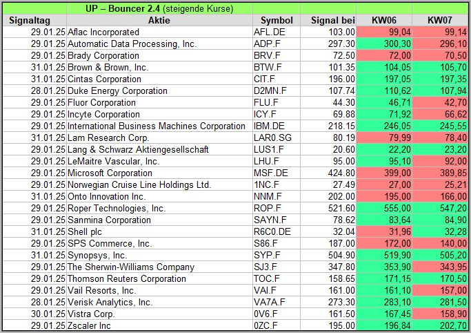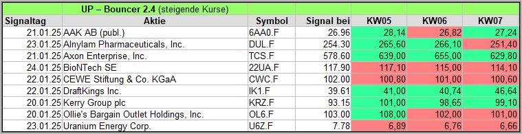 Nachfolgend die Bouncer-Ergebnisse der vergangenen 4 Wochen anhand denen jeder selbst prüfen kann, wie erfolgreich die eigene Auswahl aus den angebotenen Signal-Werten gewesen wäre. Bei den Signalen handelt es sich nur um eine Vorauswahl, die man selbst prüfen und entsprechend nutzen könnte. Die Signale werden börsentäglich in der FB Gruppe AktienChartCheck kostenfrei veröffentlicht.