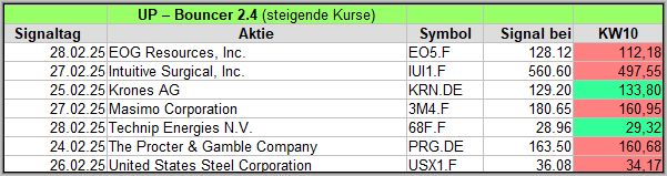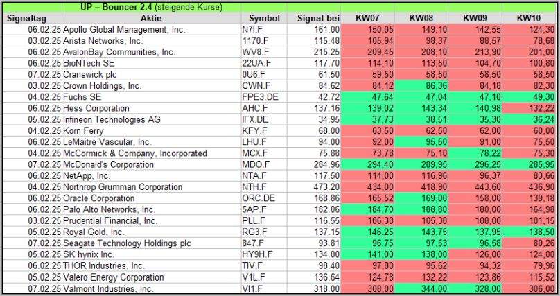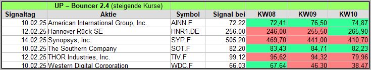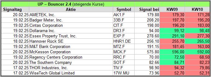 Nachfolgend die fortlaufenden Bouncer-Ergebnisse der vergangenen 4 Wochen anhand denen jeder selbst prüfen kann, wie erfolgreich die eigene Auswahl aus den angebotenen Signal-Werten gewesen wäre.