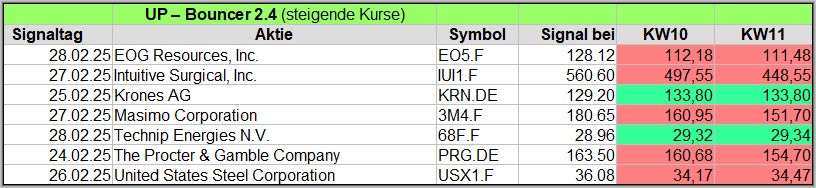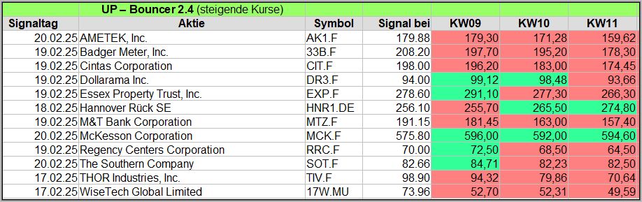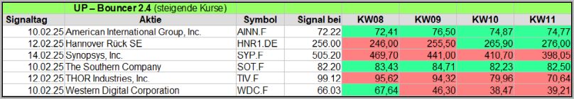 Nachfolgend die fortlaufenden Bouncer-Ergebnisse der vergangenen 4 Wochen anhand denen jeder selbst prüfen kann, wie erfolgreich die eigene Auswahl aus den angebotenen Signal-Werten gewesen wäre.