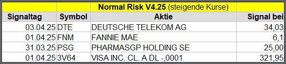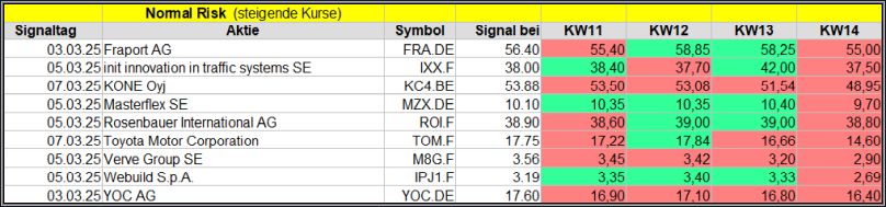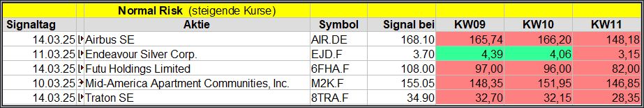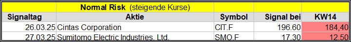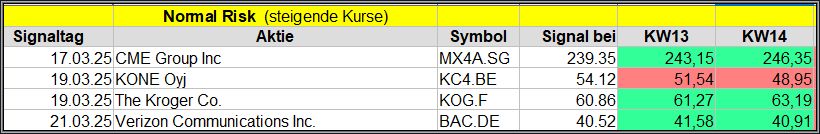 Erstaunlicherweise wurden diese Woche, durch den Normal Risk Screener immerhin 9 Signale generiert, die man aber mit gegebener Vorsicht betrachten sollte.