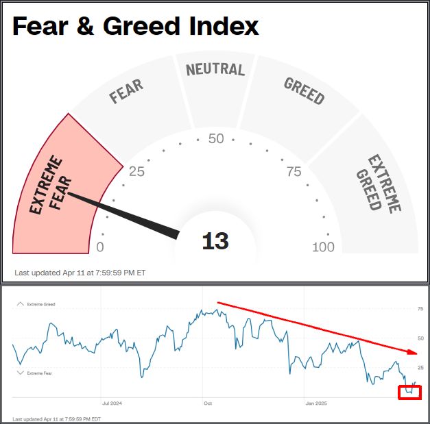 Der Fear & Greed Index hat sich in dieser Woche tief im Bereich der extremen Angst bewegt und mehrfach bei nur 3 Punkten gelegen (rotes Rechteck im unteren Bereich). Das gibt e auch nicht sehr oft, vielleicht alle paar Jahrzehnte. Am Ende der Woche ist er von 4 auf nur noch 13 Punkte gestiegen, konnte aber den Bereich extremer Angst nicht verlassen. Da half auch der Rekordanstieg am Mittwoch/Donnerstag nichts.