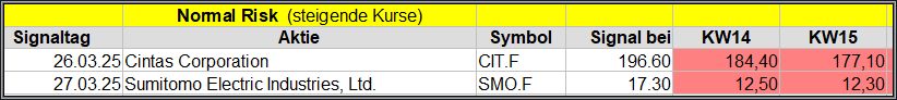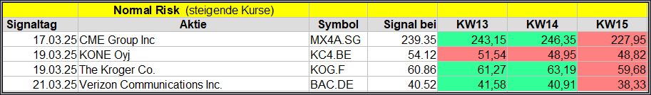 Den Kursverlauf der einzelnen Werte verfolge ich ab einem generierten Signal, über einen Zeitraum von 4 Wochen und mit einem wöchentlichen Update. (Kursiv geschriebene Texte sind in der Regel Texte aus der Vergangenheit bzw. sind Hinweise.)
