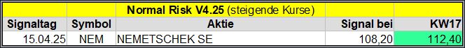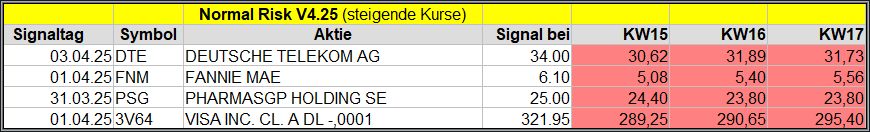 Den Kursverlauf der einzelnen Werte verfolge ich ab einem generierten Signal, über einen Zeitraum von 4 Wochen und mit einem wöchentlichen Update. (Kursiv geschriebene Texte sind in der Regel Texte aus der Vergangenheit bzw. sind Hinweise.)