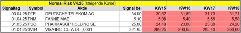Nachfolgend die fortlaufenden Screener-Ergebnisse der vergangenen 4 Wochen anhand denen jeder selbst prüfen kann, wie erfolgreich die eigene Auswahl aus den angebotenen Signal-Werten, gewesen wäre.