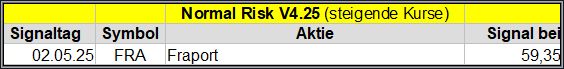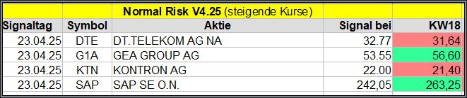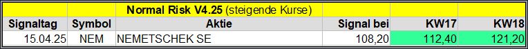 Den Kursverlauf der einzelnen Werte verfolge ich ab einem generierten Signal, über einen Zeitraum von 4 Wochen und mit einem wöchentlichen Update. (Kursiv geschriebene Texte sind in der Regel Texte aus der Vergangenheit bzw. sind Hinweise.)