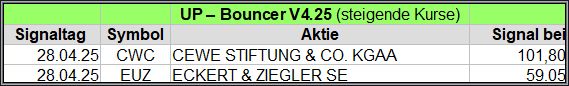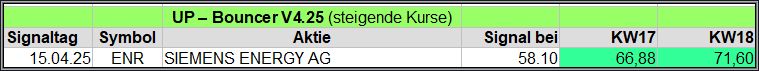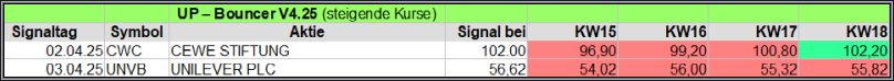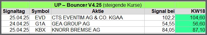 Trotzdem gab es in dieser Woche 3 Up-Bouncer Signale, die sich in den nächsten Wochen noch deutlich mehren könnten, denn so viele Werte haben ein Warnsignal generiert, die alle auch wieder ein Up-Signale auslösen, wenn sie weiter steigen. GEA Group z.B. hatte am 17.04. und am 22.04.25 Warnsignale gesendet, aber konnte jetzt ein UP-Bouncer Signal generieren (ebenso ein Normal Risk Signal am 23.04.)