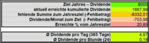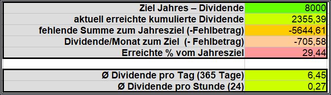 Um das Jahresziel zu erreichen, müssten jetzt in jedem der verbleibenden Monate noch mindestens 705,58€ an Dividende generiert werden.