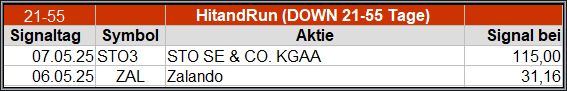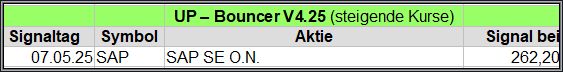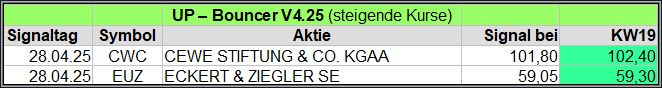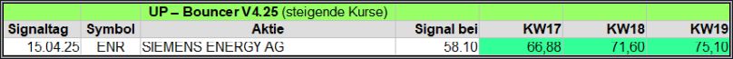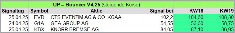 Trotzdem gab es in dieser Woche 3 Up-Bouncer Signale, die sich in den nächsten Wochen noch deutlich mehren könnten, denn so viele Werte haben ein Warnsignal generiert, die alle auch wieder ein Up-Signale auslösen, wenn sie weiter steigen. GEA Group z.B. hatte am 17.04. und am 22.04.25 Warnsignale gesendet, aber konnte jetzt ein UP-Bouncer Signal generieren (ebenso ein Normal Risk Signal am 23.04.)