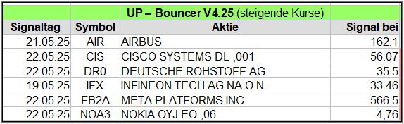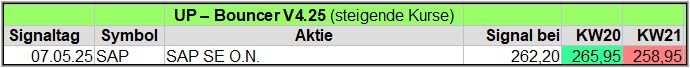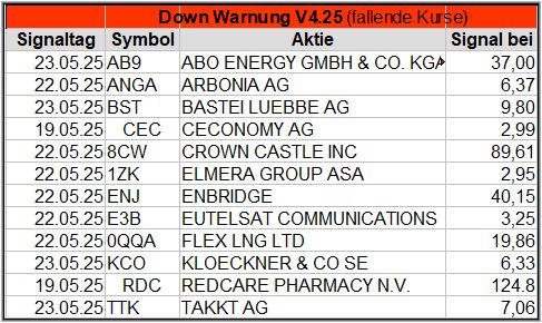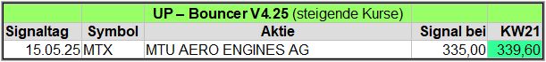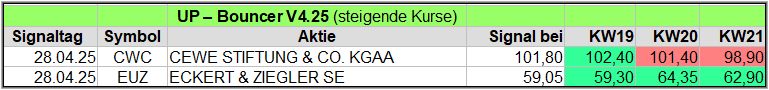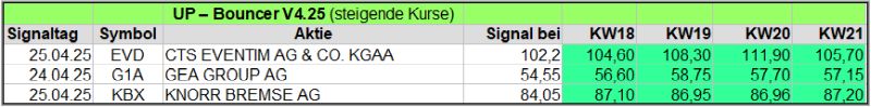 Trotzdem gab es in dieser Woche 3 Up-Bouncer Signale, die sich in den nächsten Wochen noch deutlich mehren könnten, denn so viele Werte haben ein Warnsignal generiert, die alle auch wieder ein Up-Signale auslösen, wenn sie weiter steigen. GEA Group z.B. hatte am 17.04. und am 22.04.25 Warnsignale gesendet, aber konnte jetzt ein UP-Bouncer Signal generieren (ebenso ein Normal Risk Signal am 23.04.)