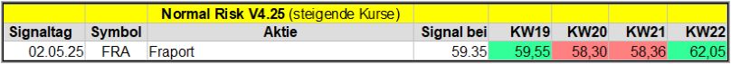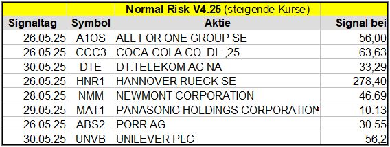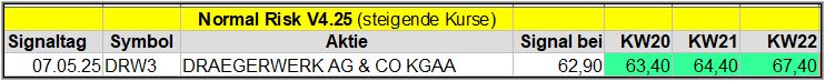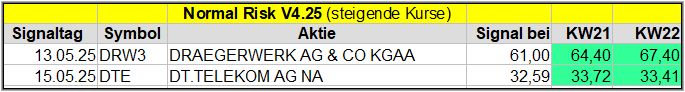 Den Kursverlauf der einzelnen Werte verfolge ich ab einem generierten Signal, über einen Zeitraum von 4 Wochen und mit einem wöchentlichen Update. (Kursiv geschriebene Texte sind in der Regel Texte aus der Vergangenheit bzw. sind Hinweise.)