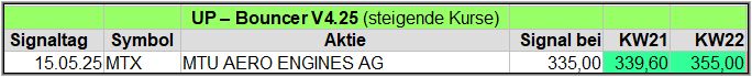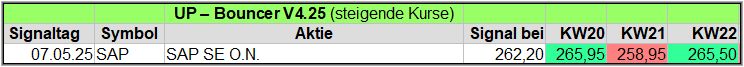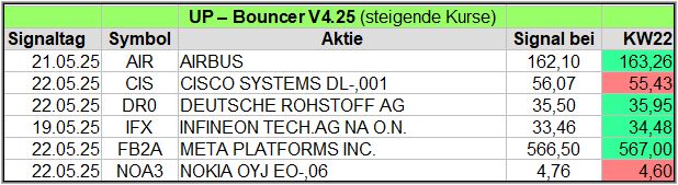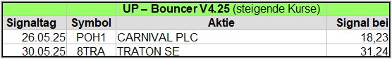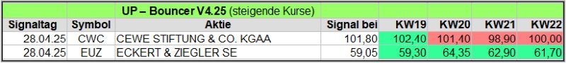Nachfolgend die fortlaufenden UP-Bouncer-Ergebnisse der vergangenen 4 Wochen anhand denen jeder selbst prüfen kann, wie erfolgreich die eigene Auswahl aus den angebotenen Signal-Werten gewesen wäre.