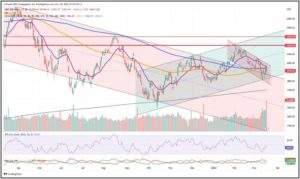 Von diesem ging es am Donnerstag wieder bis zur EMA20 bei 3.969$ nach oben, bevor es am Freitag wieder unter die SMA100 (1.955,50$) und unter die SMA200 (3.936,75$) nach unten ging. Mit dem Scheitern an der EMA20, wurde auch ein tieferes Hoch markiert, so dass wir einen Abwärtstrend sehen.