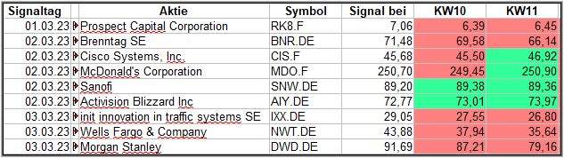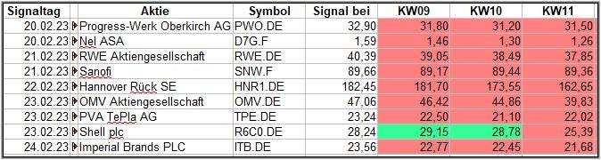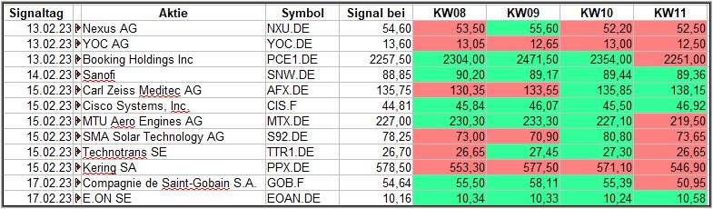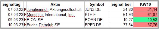 Nun kommen wir zum Update der vorigen Screener-Ergebnisse aus der KW07, KW08, KW09 und KW10, bezogen auf die Schlusskurse in KW11/23. KW06/23 fällt in dieser Woche weg.